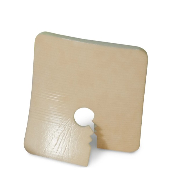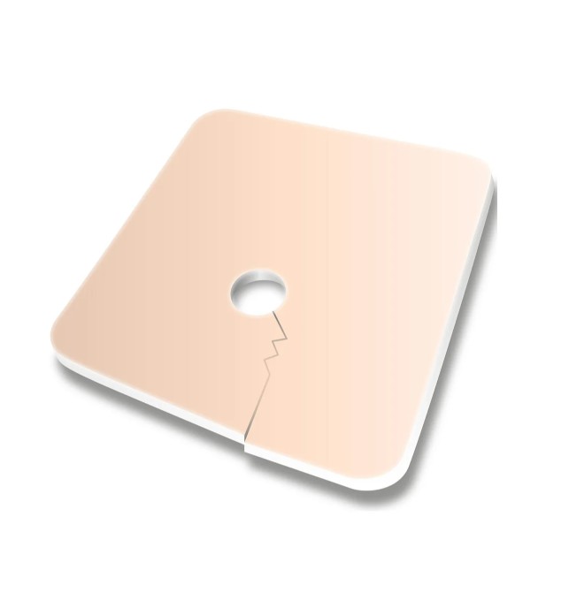 Medicazione sterile in schiuma di poliuretano, pronta all’uso, con apertura centrale per cannula tracheostomica.
